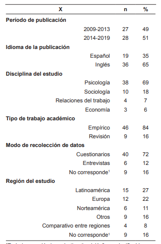 Guerra (2011) sostiene que, a pesar de estos cambios en los contextos laborales, la importancia que los sujetos otorgan a su devenir laboral continúa estando vigente. En este sentido, Dubet y Martuccelli (2000) señalan que el sujeto moderno define su identidad social, principalmente, en relación a las categorías socio-profesionales que ocupa, destacando la relevancia del trabajo en la construcción subjetiva. Por este motivo, el presente estudio se propone realizar una actualización bibliográfica del desarrollo teórico-empírico sobre el fenómeno. Para tal fin, se realizó una búsqueda electrónica de material bibliográfico, generado en los últimos 10 años, a través de distintas bases de datos, tales como ScienceDirect, SciELO, Oxford Journals, Redalyc y Dialnet. Las palabras claves utilizadas fueron: “significado del trabajo”, “centralidad del trabajo”, “importancia del trabajo”, “vínculo con el trabajo” e “involucramiento en el trabajo”. Teniendo en cuenta un criterio de actualidad, relevancia y pertinencia en relación al tema objetivo, se seleccionaron 55 artículos publicados en idioma español o inglés. A continuación, se presentan las principales características de los artículos seleccionados (Tabla 1).