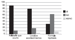 4. En los casos en los que la violencia familiar es el motivo de consulta (se diferencian los casos que implican violencia familiar en dos tipos: aquellos en que esta problemática es el motivo de consulta (40%) y aquellos en los que, aunque esta problemática se encuentra presente, la misma no es el motivo de consulta (58%)), la posibilidad del sujeto de hacer un relato es del 89,7%, mientras que el 79,3% localiza los acontecimientos ligados a la irrupción de la urgencia. En cuanto a la posibilidad de formular alguna hipótesis sobre la causa de sus síntomas, ésta disminuye a 31% (Tablas N° 4, 5 y 6 y Gráfico N° 2).