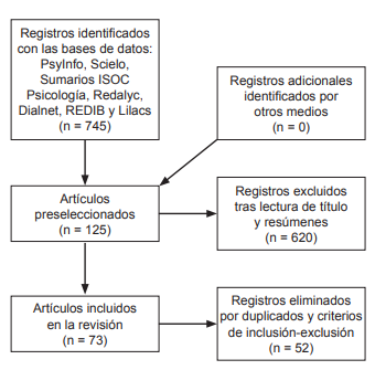 En la búsqueda inicial se obtuvieron 745 artículos. A partir de la lectura de títulos y resúmenes, se obtuvo una preselección de 125 artículos. Finalmente, se eliminaron aquellos artículos duplicados y se seleccionaron un total de N=73 artículos que cumplían con los criterios de inclusión-exclusión definidos en: a) artículos empíricos, b) estudiar algún factor psicológico, y c) medir el rendimiento deportivo (figura 1). La extracción de datos, de las dimensiones especificadas en el siguiente apartado, se realizó de forma independiente y por dos investigadores. La información fue incorporada a una base de datos constituida ad-hoc para su posterior análisis. Finalmente, la clasificación de las dimensiones correspondientes a las disciplinas deportivas y el rendimiento deportivo se obtuvieron tras consenso con el equipo de investigación.
