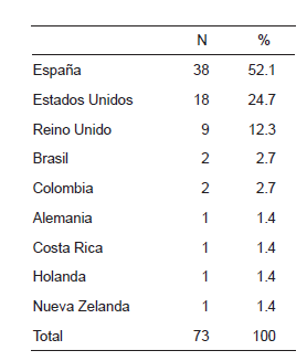 Los 73 artículos se hallaron publicados en 40 revistas científicas diferentes. El 47.9% de los artículos fueron representado por 6 revistas: Revista de Psicología del Deporte (12.3%), Cuadernos de Psicología del Deporte (11%), Journal of Sport and Exercise Psychology (11%), Internacional Journal of Sport and Excerciese Psychology (5.5%), Journal of Human Sport and Exercise (4.1%), y Revista Iberoamericana de Psicología del Ejercicio y del Deporte (4.1%). Los orígenes de las revistas se distribuyen en nueve países (Tabla 1), donde el 89% de las revistas estudiadas se concentran en los países España (52.1%), Estados Unidos (24.7) y Reino Unido (12.3%). Del total de las revistas analizadas el 60% pertenece al área temáticas de las Ciencias del deporte, de las cuales el 25% son especializadas en Psicología del Deporte y del Ejercicio Físico.