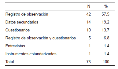 Aunque se observa cierta variabilidad en el tipo de instrumento de recolección de datos (Hernández Sampieri, Fernández Colla y Baptista Lucio, 2010) aplicados para la evaluación del rendimiento deportivo, es notoria la preponderancia del uso de registros de observación (57.5%). Este instrumento implementa la observación sistemática del cumplimiento efectivo o no de una conducta específica que ha sido predeterminada por el investigador. En menor porcentaje, también fueron usados fuentes de datos secundarios (19.2%) y los cuestionarios (13.7%). El primero se basa en utilizar datos previamente recolectados por alguna institución televisiva o deportiva, mientras que el segundo consiste en un conjunto de preguntas diseñadas por los investigadores para medir uno o varios aspectos del rendimiento. Solo dos artículos se han utilizado la entrevista y un instrumento estandarizado por separado (2.8%; N=2) para analizar el rendimiento deportivo. Por último, el 6.8% de los estudios utilizaron dos instrumentos medición de manera combinada: registros de observación y cuestionarios (Tabla 2).