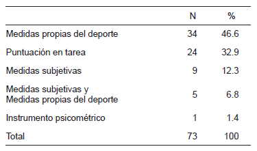 1. Las medidas propias al deporte conformaron el 46.6% de los artículos analizados. Las mismas se constituyen por medidas de rendimiento deportivo evaluadas en contextos naturales en los que se practica cada deporte. Sus características y evaluación dependen de las reglas y acciones motrices propias y definitorias de cada disciplina deportiva.