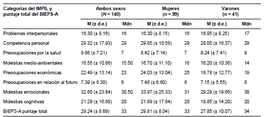 En la tabla 1 se presentan las medidas de resumen de los puntajes en IMPIL y BIEPS-A en la muestra total y en cada sexo.