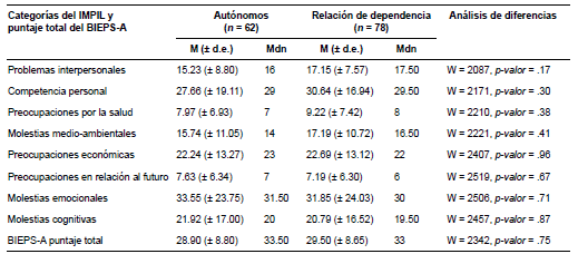 Por una parte, se analizaron diferencias según si el tipo de relación en el puesto laboral correspondía a AUT o bien a RDEP. No se hallaron diferencias estadísticamente significativas entre los puntajes de impacto de las categorías del IMPIL en función del tipo de relación laboral (Tabla 2). Tampoco se halló diferencia significativa entre los puntajes totales del BIEPS-A según el tipo de relación laboral (Tabla 2). En la tabla 2 se presentan las medidas de resumen de los puntajes obtenidos en IMPIL y BIEPS-A según tipo de relación en el trabajo actual.