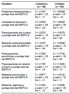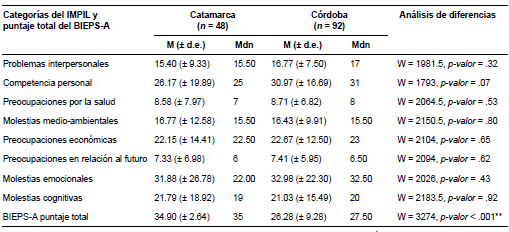 Del mismo modo, se analizaron diferencias según la provincia de residencia de los participantes (Córdoba y Catamarca). No se hallaron diferencias estadísticamente significativas entre los puntajes de impacto de las categorías del IMPIL según la provincia de residencia de los participantes (Tabla 3). En cambio, se halló que el puntaje total del BIEPS-A fue significativamente más alto en los participantes de Catamarca que en los de Córdoba (Tabla 3). En la tabla 3 se informan las medidas de resumen de los puntajes obtenidos en el IMPIL y el BIEPS-A según provincia.