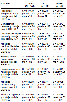 Asimismo, se evaluaron asociaciones entre los puntajes de impacto de las categorías del IMPIL y el puntaje total del BIEPS-A para los participantes AUT, por una parte, y para los participantes RDEP, por la otra. En los participantes AUT se halló asociación significativa, de tipo inverso, entre problemas interpersonales y BIEPS-A puntaje total, pero no entre las demás categorías del IMPIL y el puntaje total del BIEPS-A (Tabla 4).