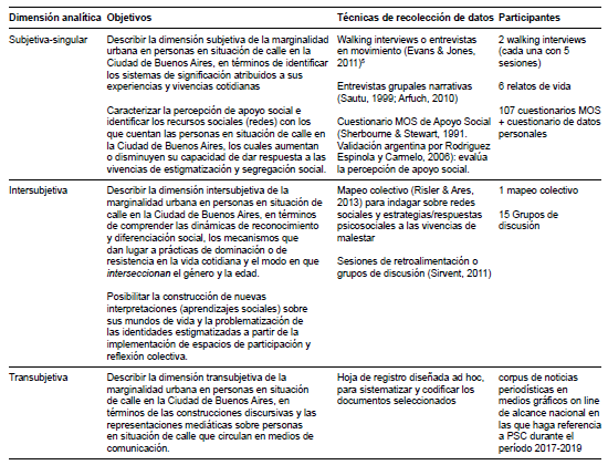 A lo largo de todo el proyecto de investigación, se utiliza una estrategia plurimetodológica que combina el uso de fuentes primarias y secundarias. La estrategia se organizó utilizando el esquema conceptual propuesto por Jodelet (2008) sobre las esferas de pertenencia de las representaciones sociales o niveles de anclaje subjetivo/singular, intersubjetivo y transubjetivo[3], tal como se muestra en la siguiente tabla[4]: