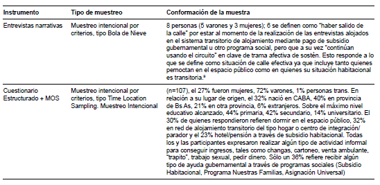 El universo lo constituyen las PSC, de diferentes sexos y mayores de 18 años, que se encuentran en situación de calle efectiva[2] en la Ciudad Autónoma de Buenos Aires. Se utilizó un muestreo teórico (Glaser & Strauss, 1967) en función de criterios de inclusión predeterminados: a) que la propia persona se defina como “en situación de calle”, considerando su precariedad habitacional (vía pública, paradores del Gobierno de la Ciudad y hogares de tránsito), laboral (desempleo o trabajos informales de poca remuneración) y relacional (utilización de los servicios del circuito socio-asistencial de la CABA), b) que tenga 1 año o más en situación de calle, c) que acepte participar voluntariamente de la investigación firmando un consentimiento informado.