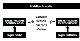 b. El espacio en su dimensión social, en términos de las dinámicas de relación que se establecen entre pares, con otras personas en la ciudad que no están en situación de calle, con quienes se ocupan de su cuidado en la red socio-asistencial. Las relaciones entre las personas y los espacios responden al papel que éstos juegan en sus vidas y a los procesos mediante los cuales se desarrollan como significativos, tanto de manera positiva como negativa. Esto puede relacionarse con el anclaje intersubjetivo o esfera de pertenencia intersubjetiva de las RS. En estas relaciones se pone en evidencia la tensión entre lógicas tutelares de intervención psicosocial que configuran a las PSC como subjetividades que deben ser controladas y las lógicas restitutivas desde las que se configuran subjetividades deseantes. El argumento colectivo sobre necesitar cuidados, también se desprende de relatos de las PSC quienes se refieren a sí mismos como “aquéllos que no pueden”, “que tienen problemas”, “que no tienen ganas”, “que son irresponsables”. Esas percepciones sobre sí mismos, producto de la negociación intersubjetiva de significados, se sostiene en atribuciones estigmatizantes. Las instituciones por las que circulan se convierten en espacio de producción subjetiva, la cual está condicionada en función de aspectos temporales. Por un lado, entre quienes respondieron el cuestionario (n=107), un 70% manifestó que no es la primera vez que está en situación de calle, incluso refieren que “habitar la calle” se configura como un ciclo de entrar-salir. De algún modo, este campo de problemas tiende a la cronicidad, configurándose como “ciudadanías asistidas”. Esto da lugar a que se desplieguen tecnologías de control en las que se fundamentan las respuestas socio-asistenciales producidas y reproducidas por los dispositivos públicos y privados. Se configura una narrativa del reconocimiento organizada en función de una dinámica de segregación-integración, y de control- resistencia.