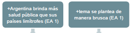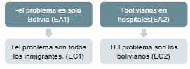 Al unir ambas citas textuales, la noticia n°2 adjudica la siguiente argumentación a Morales: “No quisiera concentrar el tema en un Argentina vs Bolivia” (sin embargo) “Hay no residentes bolivianos que están hace dos meses en el hospital”. Este tipo de contra-argumentación es de carácter indirecto y busca, a partir de un segundo enunciado argumentación (EA2) del cual se infiere un enunciado-conclusión implícito (EC2), contra-argumentar el enunciado-conclusión implícito (EC1) del primer enunciado-argumentación (EA1) (figura 1).