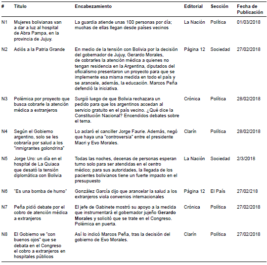 Se conformó un corpus de noticias periodísticas en medios gráficos locales de alcance nacional en las que haga referencia a la población migrante. Al pretender estudiar el tratamiento mediático y la función de los medios de comunicación en la construcción y circulación de representaciones sociales sobre un tema específico, se realizó una selección intencional en función de los siguientes criterios: