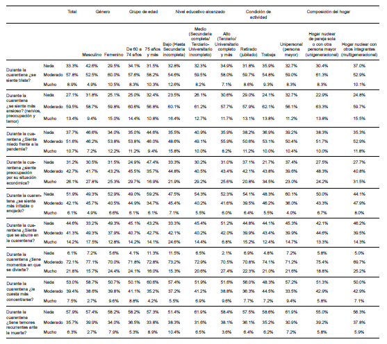 Los resultados de la ansiedad, definida como “nervios, preocupaciones y temores” durante la pandemia, encontró en la mayoría cambios moderados. Está mayormente presente en las mujeres (74,9%, sig. 0,05), en las personas entre 60 y 74 años (75,0%, sig. 0,04), y en las personas que viven en hogares con parejas – unigeneracional (77.1%, sig. 0,02) y con otras personas – multigeneracionales (75,2%, sig. 0,02) y estas diferencias fueron estadísticamente significativas. En relación al miedo el porcentaje que dijo tener mucho miedo es bajo. Sin embargo, se encontraron diferencias estadísticamente significativas y las distribuciones fueron similares a la ansiedad, donde se encontraron mayores porcentajes tanto en las mujeres (66,0% las respuestas de “moderado” y “mucho”, sig. 0,00) como en los más jóvenes (65,0%, sig. 0,00).