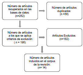 El total de artículos hallados fue de 252 (ver Figura 1).Se excluyeron 56 por duplicados, quedando así 196 artículos. Luego de la lectura del título y resumen de cada uno, se eliminaron 182 artículos por encontrarse entre los criterios de exclusión. Es así que el número total de artículos que conforman nuestro corpus es de 14.