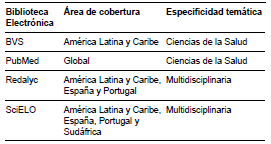 Las bases electrónica seleccionadas fueron: Scientific Electronic Library Online (SciELO), PubMed, Redalyc y Biblioteca Virtual en Salud (BVS), lo que garantiza cierta homogeneidad del corpus para su análisis.