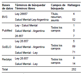 Como se observa, no encontramos en nuestra búsqueda artículos como el nuestro, esto es, de revisión sobre la producción científica en torno a la ley de salud mental. Los artículos analizados abordan desde distintas perspectivas e intereses la ley, pero ninguno recupera de modo sistemático las publicaciones sobre el tema, permitiendo la construcción de un panorama global sobre el estado del arte.