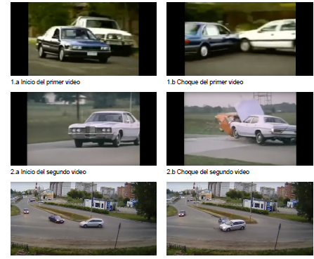 se empleó una plataforma online para recolectar las respuestas. Todos los participantes recibieron primero una breve descripción del experimento y una solicitud de consentimiento informado en cumplimiento de las normas éticas vigentes para la investigación psicológica. Luego de dar su consentimiento, contestaron preguntas sobre su edad y género. Se mantuvo la confidencialidad de la identidad de los participantes. No se registraron nombres, ni correos electrónicos, ni direcciones IP. Luego, recibieron una breve consigna que indicaba ver una sola vez cada uno de tres videos de accidentes viales y luego dar una estimación de velocidad de los vehículos que chocaban. Se registraron las respuestas luego de cada video. Se aleatorizó el orden de presentación de los tres videos. La duración fue de 8, 10 y 14 segundos respectivamente. Los tres videos han sido empleados en réplicas previas del experimento original de Loftus y Palmer (1974). Los dos primeros son antiguos, de la década de 1970, el tercero es más reciente. Las velocidades reales no son conocidas porque sólo interesa en este trabajo la estimación subjetiva basada en el recuerdo. Sin embargo, pareciera que el segundo video muestra vehículos que circulan a mayor velocidad, mientras que el primero y el tercero parecen llevar velocidades bajas. La Figura 1 muestra capturas de pantalla de los tres accidentes viales presentados a todos los participantes.