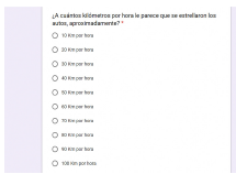 se empleó un diseño experimental completamente aleatorizado (Kuehl, 1999). La variable independiente fue la asignación del verbo a la pregunta por el testimonio. Luego de ver cada video, cada participante respondió una pregunta según el grupo asignado: ¿A cuántos kilómetros por hora le parece que se estrellaron los autos, aproximadamente? O bien, ¿A cuántos kilómetros por hora le parece que entraron en contacto los autos, aproximadamente? La variable dependiente fue la estimación de velocidad dada por cada participante según una escala en kilómetros que va desde 10 hasta 100 en intervalos de 10.