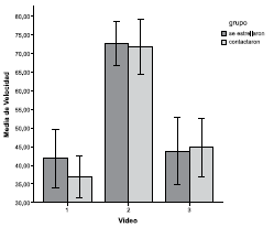En todos los casos las variables computadas resultaron compatibles con los supuestos de normalidad y homogeneidad de varianzas por las pruebas de Kolmogorov-Smirnov y Levene, respectivamente, con p valores superiores a 0,20. La Figura 3 presenta un resumen visual de los resultados analíticos de la Tabla 1 agrupados por video. Cada par de barras permite apreciar la diferencia de estimación subjetiva de velocidad de los participantes asignados a la condición estrellarse versus contactarse. Para cada barra se calcularon intervalos de confianza en torno a la media.