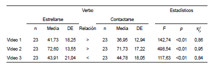 Resultados y discusión: los resultados obtenidos son compatibles con la hipótesis H1. La media se refiere al promedio de estimación de velocidad de todos los participantes para cada video. En la Tabla 1 se presentan los estadísticos correspondientes.