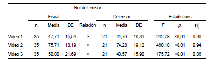 La Tabla 3 presenta un resumen de los resultados obtenidos en el experimento 2. La Figura 4 muestra las velocidades estimadas para cada video mediadas por los comentarios del fiscal o del defensor. En ambos casos se observaron velocidades mayores para el grupo que recibió el comentario del fiscal.