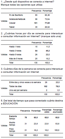En el relevamiento de los datos se utilizaron dos instrumentos que indagaron el uso de las TIC en la vida cotidiana y en las prácticas docentes desarrolladas, como así también el tipo de práctica educativa realizada sin el uso de tecnología.