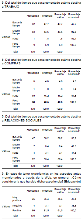 Otra línea interesante para abordar, es la que se observa en los ítems 5 y 6 que se desdoblan en cuatro opciones cada uno, tiempo que pasan conectados (Educación, Trabajo, Compras, Relaciones Sociales) y cómo perciben que ha sido la experiencia en cada una.