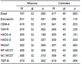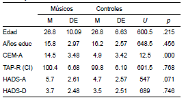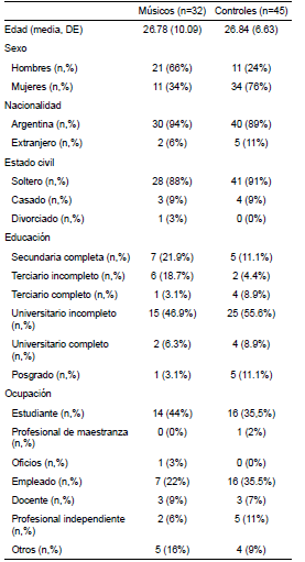 Tal como se ve en la Tabla 1, los sujetos músicos tienen una edad promedio de 26.78 años (de= 10.09) y primó la participación masculina (66%), el estado civil soltero (88%), nacionalidad argentina (94%) y estudios universitarios incompletos (46.9%). La ocupación principal fue estudiante (44%). En relación con los no músicos, la edad media fue de 26.84 años (de= 6.63), primando la participación femenina (76%), el estado civil soltero (91%), nacionalidad argentina (89%) y estudios universitarios incompletos (55.6%). La ocupación principal fue estudiante (35.5%).