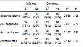 En cuanto a las actividades de tiempo libre que conforman la RC (Tabla 2), se indagó, tal como sugiere la literatura acerca del tema, respecto de: el aprendizaje de un segundo idioma, la realización de actividades cognitivas desafiantes, actividades cardiovasculares y/o práctica de estiramientos. Se observa que, en el caso de los músicos, prevaleció la participación en actividades cardiovasculares (81%) y el aprendizaje de un segundo idioma (81%). Mientras que, en el caso de los no músicos, prevaleció la participación tanto en actividades cognitivas (78%) como cardiovasculares (78%). Al realizar la prueba chi-cuadrado de Pearson, no se encontraron diferencias significativas entre ambos grupos en la realización de tales actividades, siendo el entrenamiento musical la tarea diferencial realizada entre ambos grupos.