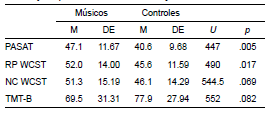 En relación a los resultados de cada grupo en las mismas, se advierte un rendimiento superior de los sujetos músicos, con respecto a los no músicos, en tareas que implican aspectos más complejos de las funciones ejecutivas como son el WCST y el PASAT. En el Test de categorización de Wisconsin, se observaron diferencias a favor de los músicos en la dimensión “respuestas perseverativas”, advirtiéndose menor número de errores en la realización de la tarea. Coincidiendo esto con los resultados observados en estudios anteriores (Moreno, Bialystok, Barak, Schellenberg, Cepeda & Chau, 2011; Moussard, Bermudez, Alain, Tays & Moreno, 2016; Okada, 2016; Zuk, Benjamin, Kenyon & Gaab, 2014), que señalaron el efecto positivo del entrenamiento musical en las funciones ejecutivas. Indicando que el entrenamiento musical mejora habilidades como la inhibición, la flexibilidad, la actualización, switching o la velocidad de procesamiento. Remarcándose, además, que el entrenamiento musical produce mejoras en flexibilidad y velocidad de procesamiento observados también en los resultados del presente estudio.