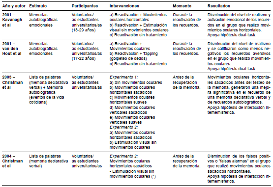 Mediante una tarea computarizada en la cual los participantes debían seguir un círculo que se movía de izquierda a derecha (condición horizontal) o de arriba hacia abajo (condición vertical); se evidenció que únicamente movimientos oculares horizontales realizados previamente a la evaluación de una lista de palabras generaban una mejora significativa en la memoria episódica (Christman et al., 2003). Estos resultados pudieron ser replicados en el mismo trabajo con memorias neutras de eventos de la vida diaria (Christman et al., 2003). También se observó una mejora en la memoria mediante una disminución en la cantidad de “falsas alarmas” reportadas en una memoria declarativa verbal (Christman et al., 2004). En este último trabajo, se incluyó una condición de control que implicaba observar un círculo que cambiaba de color, para evaluar si la estimulación visual periódica en ausencia de movimientos oculares podría tener algún efecto sobre el rendimiento. Este tipo de estimulación demostró no tener un efecto significativo sobre la memoria.