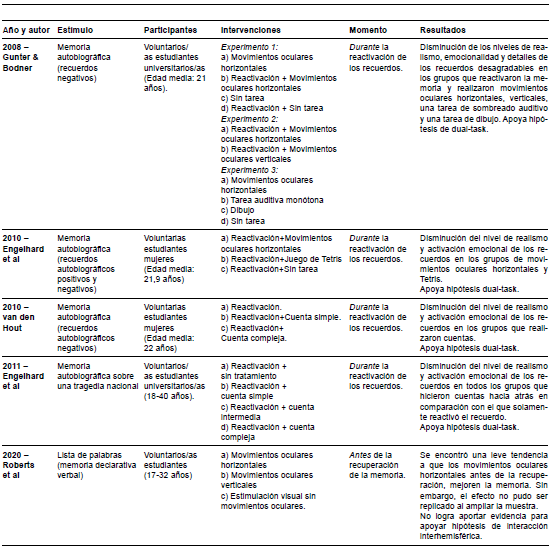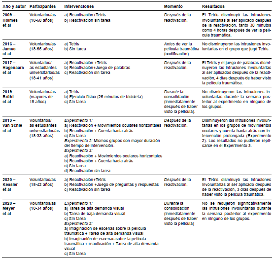No existe acuerdo acerca de por qué el juego de Tetris genera una reducción en los recuerdos intrusivos aunque, además de la hipótesis de carga de la memoria de trabajo, se propone que la tarea de Tetris podría estar generando una competencia de recursos por alta demanda cognitiva (Holmes et al., 2010). En la Tabla 2 se resumen los trabajos recopilados que utilizaron un paradigma de trauma experimental.
