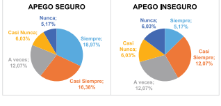 A continuación presentamos parte de los resultados obtenidos hasta el momento a través de preguntas seleccionadas del cuestionario elaborado por el equipo de investigación, dirigido a madres y padres, que permitieron relevar datos acerca de actitudes, valores, creencias e información sobre los diferentes aspectos referidos a la crianza de sus hijos. Estas se relacionaron con los resultados del Cuestionario de Experiencias en Relaciones Cercanas (Fraley, Wallier y Breman, ECS-RS 2000, validado en el marco del proyecto UBACyT2012-2015 por Paolicchi y Kohan Cortada) que indaga el tipo de apego de las madres y los padres. De acuerdo a esta evaluación los entrevistados con puntuación para apego seguro fueron 68 (58,62%) y los entrevistados con puntuación para apego inseguro fueron 48 (41,38).