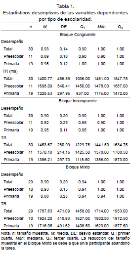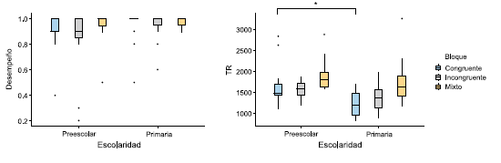 En este estudio, las/os participantes se agruparon en función del nivel de escolaridad al que pertenecían, comparando el nivel Preescolar y Primaria, ya que se considera al pasaje entre uno y otro nivel como una transición acompañada por cambios vinculados al desarrollo. Al comparar el Desempeño y el TR entre los grupos Preescolar y Primaria en cada bloque de la tarea, no se hallaron diferencias en el Desempeño en función del nivel escolar. Sin embargo, se encontraron diferencias en el TR del Bloque Congruente y una tendencia a que los grupos se diferenciaran en el Bloque Incongruente. En ambos casos el TR resultó mayor en quienes asistían a la escolaridad Primaria.