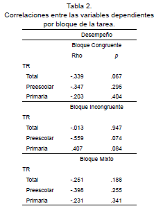 A continuación, se realizaron correlaciones de Spearman para evaluar la presencia de asociación entre las variables dependientes. No se encontraron correlaciones estadísticamente significativas entre el Desempeño y el TR. Se observó una tendencia para el total de la muestra en el Bloque Congruente (p = .067) (Tabla 2).