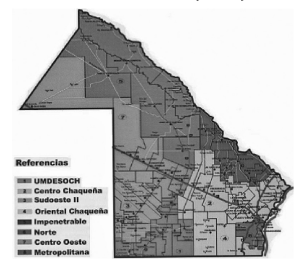 En ese sentido, el gobierno de la provincia del Chaco viene trabajando desde hace unos años, a través de la Secretaría de Planificación y Evaluación de Resultados, en la instalación del desarrollo local como estrategia de intervención y en la regionalización como espacio territorial de aplicación, en el marco del Programa de Regionalización y Desarrollo Local. Como consecuencia de este programa, la provincia del Chaco cuenta hoy con ocho regiones constituidas por la voluntaria asociación de los municipios. Estas regiones son: 1) UMDESOCH7; 2) Centro chaqueña; 3) Oriental Chaqueña; 4) Sudoeste II; 5) Impenetrable; 6) Norte; 7) Centro Oeste; 8) Metropolitana. (Figura 1)