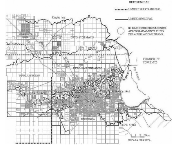 El municipio de la ciudad de Resistencia tiene una extensión de 20 196 hectáreas y una población de 275 962 habitantes, según el último censo nacional (2001), lo cual representa el 28% de la población provincial; es además capital del estado provincial, y en su territorio se asientan los distintos organismos de los poderes Ejecutivo, Legislativo y Judicial. En Resistencia, cerca del 70% de la población urbana se encuentra concentrada en un radio de 3 km (véase la figura 2).
