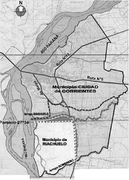 Cuenta con una superficie de 522 km2 (Corrientes abarca aproximadamente el 80% de la extensión superficial del departamento Capital, siendo el 20% restante el ejido municipal de Riachuelo), representando sólo el 0.58% del total provincial (88 886 km2) y una población de 325.570 habitantes18, lo cual representa cerca del 35% de la población provincial y el 8.6% de la población de la región del NEA. En el municipio de Corrientes cerca del 70% de la población urbana se encuentra concentrada en un radio de 2.51 km. (Figura4)
