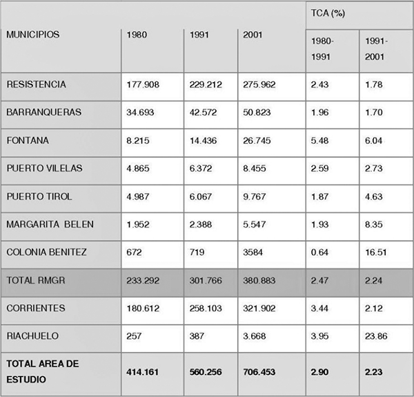 Fuente: elaboración propia con datos del INDEC.La organización actual de la RMGR presenta muchas carencias que habría que corregir. En primer lugar, la organización metropolitana tendría que darse en la integración del territorio, respondiendo adecuadamente a las realidades territoriales presentes y su previsible evolución, y en segundo lugar, la nueva organización tendría que considerar la integración con el Gran Corrientes, ya que la asociación de ciudades próximas, como estrategia de desarrollo urbano, puede complementar eficazmente las políticas individuales.