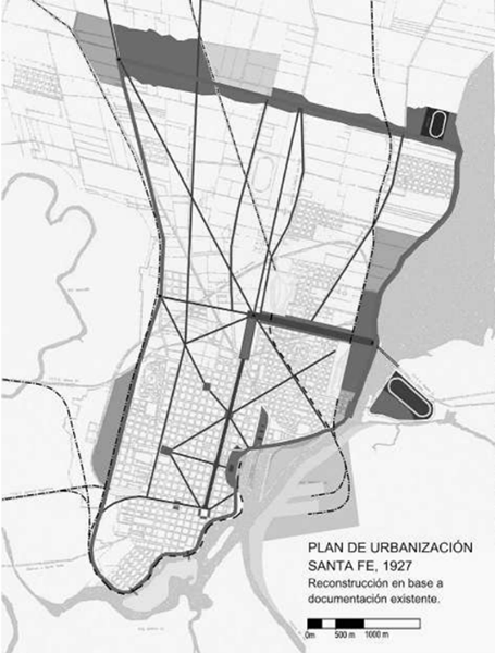 El Plan del 27 proponía, de cara al río Paraná, la apropiación de un sector del frente fluvial Sur-Este para instalar un puerto de envergadura, en torno al cual se estructurarían una serie de espacios públicos de cara a la ciudad, y hacia el Norte, un paseo costanera enfrentado, laguna Setúbal11 mediante, un parque zoológico y un aeródromo que terminaban por definir la orilla oriental de la ciudad, reservando para la margen del río Salado, al Oeste, la cara menos atractiva de la ciudad: la zona industrial. (Imagen 1)