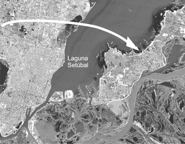 Fuente: imagen LAND SAT, Servicio de catastro e información territorial de la provincia de Santa Fe (2004)Esta intención había sido fuertemente promovida por los primeros responsables de la oficina de Planeamiento en las primeras formulaciones que se conocieron con el nombre de Plan Nardi.13 El Plan del 80 constituyó una reelaboración del Plan Nardi, y su propuesta, si bien no enfatizaba en la extensión hacia el Este de la ciudad, sí daba lugar o blanqueaba una situación que se estaba dando: la ocupación suburbana del albardón costero con casas de fin de semana y algunas instalaciones de intención turística. Así, el Plan del 80 establecía una comunicación entre la ciudad y el albardón a través de un cruce de la laguna ubicado al Norte de la ciudad, que se desprendía de la avenida de circunvalación proyectada. Esta avenida estaba pensada como colectora de los flujos regionales y vía de transición para ingresar desde las autopistas —concebidas como vías regionales— en la ciudad. La idea de este cruce retomaba, con una mínima variación en cuanto a ubicación, las propuestas que en 1959 ya se habían hecho como parte de las obras complementarias al Proyecto de canalización del río Bermejo14, proyecto emanado del CONADE.