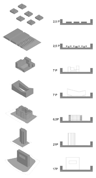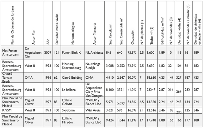 Fuente: elaboración propiaLos siete proyectos singulares empleados ejemplifican la diversidad de ocupación y mezcla tipológica posible en proyectos con alta densidad. De mayor a menor ocupación (orden empleado en la ilustración anterior), los proyectos estudiados son los siguientes: Funen Blok K, de NL Architects; Housing Sporembourg, de Nautelings Riedijk; Carré Building, del grupo OMA; La ballena, de De Arquitekten Cie y Frits Van Dongen; Edificio Celosía, de MVRDV y Blanca Lleó; Skydome, de Wiel Arets; Edificio Mirador, de MVRDV y Blanca Lleó. En la tabla inferior podemos ver los datos característicos de cada uno de los edificios, y con ello una primera aproximación métrica a sus conformaciones.