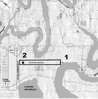 (elaboración propia sobre plano IGM)Primero, hasta 1938 funciona en un modesto “rancho” con un solo salón de clase proporcionado por don Antonio Vargas, ubicado en el Lote Rural 203 detrás de una faja de espeso monte anexa a un antiguo brazo del río Negro, paisaje propio del Chaco húmedo oriental que nomina simbólicamente su origen como “Escuelita de monte”. Comienza con veintidós alumnos: nueve varones y trece mujeres, y tiene por muebles a “cajones y tablones cedidos por el propietario del local” (LH, D 2: 2).9