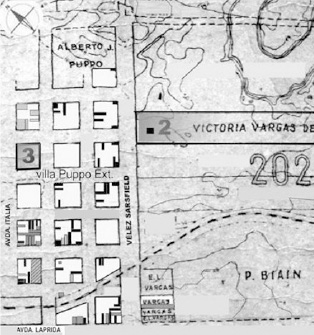El volumen de obra pública del Plan Quinquenal, en realización durante 1948, lo señala la prensa por “falta de cemento”13. Por Ley de Fomento de Territorios Nacionales, desde 1948, las municipalidades reciben ayuda nacional para mejora elemental de infraestructura, entre otros, que alcanza a Resistencia. Avanzado 1949, coexisten en el lugar diferentes dinámicas socioespaciales que vertebra la avenida Vélez Sarsfield, referencia de orientación y observación de los relatos. A partir de su “conveniente arreglo por la Municipalidad, que permite llegar con automóvil (LH, D 2: 3), a su izquierda en el L. R. 201 sucede la creciente ocupación de Villa Puppo “Extensión”.