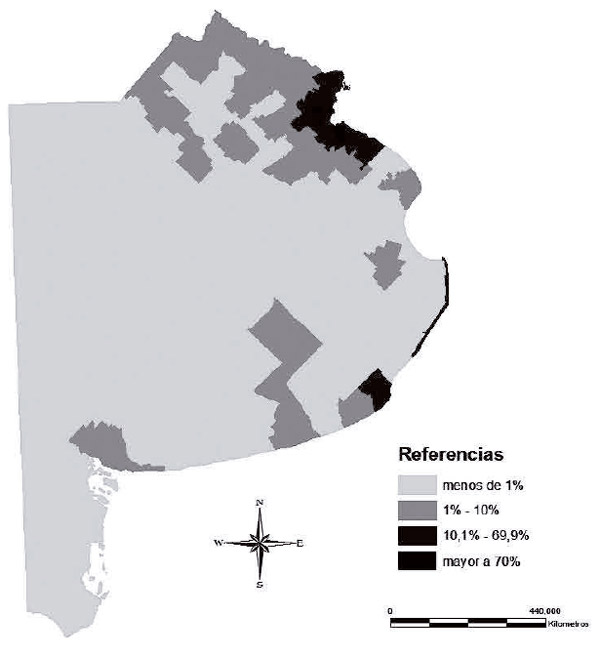 Un análisis a nivel provincial permite observar en la figura 2 que los partidos que presentan una superficie mayormente urbana se ubican próximos a la Ciudad Autónoma de Buenos Aires (CABA), luego en forma de cinturón se presentan los partidos que poseen rangos entre el 10,1 % y el 69,9 % y que son cuatro los partidos que lindan con la costa Atlántica (Villa Gesell, Pinamar, La Costa, General Pueyrredón) y presentan valores dentro de este rango.
