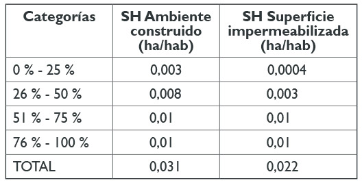 Se obtuvo que el habitante del partido de General Pueyrredón se apropia de 0,031 hectáreas a los fines de habitar, obtener servicios y desarrollar sus actividades urbanas (ambiente construido), mientras que requiere un área impermeabilizada de 0,022 hectáreas, tal como se observa en la tabla 2.