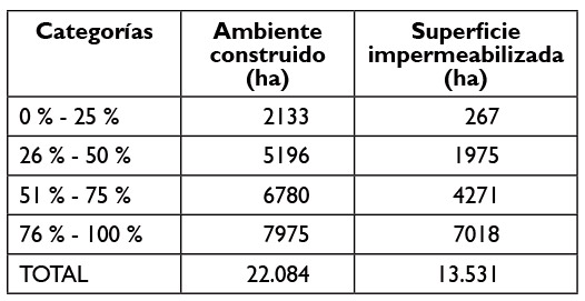 Los cálculos realizados a partir de los rangos explicados en la metodología para estimar la superficie construida e impermeabilizada dan cuenta de que 22.084 hectáreas son apropiadas por la población del partido en estudio para uso urbano, mientras que 13.531 hectáreas corresponden a superficies impermeabilizadas, el equivalente a 61,27 % del ambiente construido.
