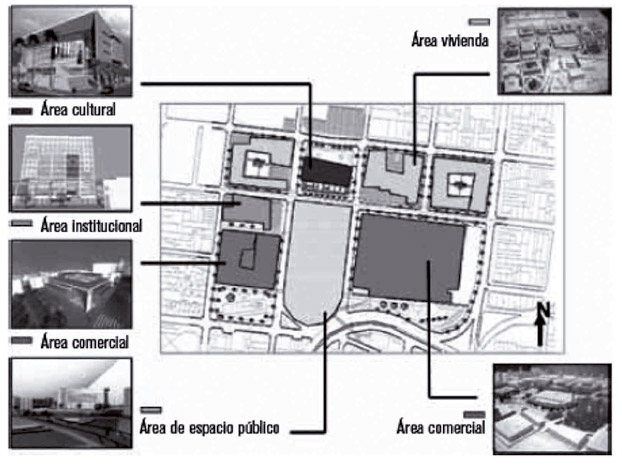 Fuente: Alcaldía de Pereira (2002)A pesar de las contradicciones generadas por la operación, se logró que el centro otorgara prestigio e hiciera atractiva la ciudad. Finalmente este sería “recuperado” a través de dos espacios comerciales, un edificio para actividades de economía terciaria, un centro cultural, una plaza cívica y un parque. El prestigio reposó principalmente en la intensificación de la actividad comercial “moderna”, promovida a través del centro comercial del que se habló al principio de este artículo y del almacén de grandes superficie Éxito. Esta nueva situación concretaba la intención de la administración municipal de promover un cambio de vocación económica para la ciudad: se pasaba de depender de la diezmada economía del café y de una industria agroalimentaria y de textiles también en decadencia, a una economía comercial y de servicios que posicionaba a la ciudad como un centro de comercio regional.