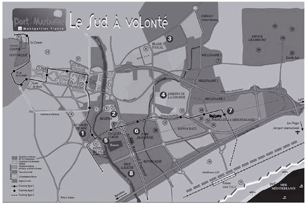 Fuente: Planeación Municipal (2002)A miles de kilómetros de distancia, en una ciudad intermedia del sur de Francia, Montpellier6, se ha venido adelantando una operación que intervino radicalmente el espacio urbano, siguiendo una intención similar de crear un efecto de atracción. Port Marianne es la punta de lanza más reciente de esta voluntad de impactar y atraer a partir de la intervención sobre el espacio urbano. Port Marianne es una operación urbanística adelantada para expandir la ciudad de Montpellier hacia el mar Mediterráneo, siguiendo el curso del río Lez en un área de aproximadamente cuatrocientas hectáreas en dirección al este.