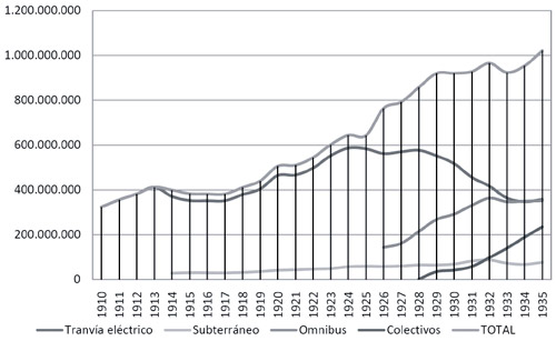En el contexto de las rápidas y profundas transformaciones urbanas que tuvieron lugar entre mediados de 1880 y fines de la década de 1930, que convirtieron a Buenos Aires en una metrópolis moderna (Gorelik, 1998), no solo creció la población y se expandió el espacio urbano, sino que se renovaron drásticamente los modos de transporte público a través de la electrificación del tranvía (1897-1909), la implementación del primer subterráneo (en 1913 y cuatro líneas más entre 1930-1944) y la emergencia del transporte automotor (el ómnibus en 1923 y los llamados auto-colectivo en 1928 que, hasta 1933, consistían en taxis compartidos utilizados para el transporte público, con capacidad de seis pasajeros, una tarifa única y recorridos determinados; luego se convirtieron en mini-buses de once pasajeros). El ferrocarril, que desde fines del siglo XIX venía influyendo en los patrones de expansión urbana, comenzará en la década de 1920 a tener una actuación más ponderada en el movimiento de pasajeros urbanos (para 1929, por ejemplo, representaba el 13 % del total de pasajeros transportados frente al 78 % de los tranvías y el 9 % de la única línea subterránea).1 En el período analizado, el tranvía tendrá un rol predominante sobre el resto de los modos, antes de ceder al avance del transporte automotor (gráfico 1).