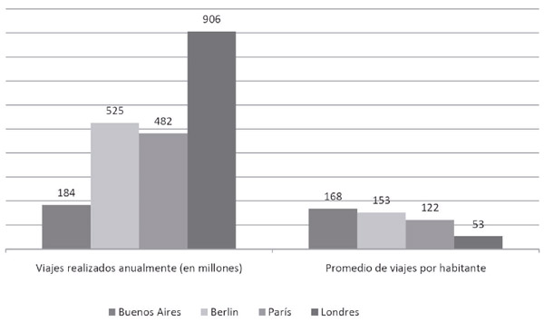 Si bien el crecimiento poblacional es un factor que incrementaba el número de viajes, la alta frecuencia de uso del transporte público sería una particularidad de Buenos Aires, incluso mayor a otras ciudades con sistemas de transporte más expandidos —como se observa en el gráfico 2 con respecto al tranvía y en la tabla 1 respecto del subterráneo—. Este fenómeno tal vez se explique por el precio relativamente accesible del pasaje (diez centavos) que se mantuvo por varias décadas, tal vez por la cantidad de combinaciones o porque era usual para ciertos sectores regresar a casa durante el almuerzo (con lo cual se realizaban por los menos cuatro viajes al día entre el hogar y el trabajo).